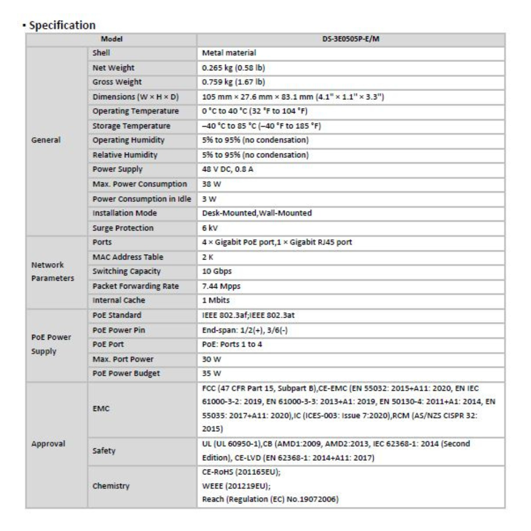 4 Port Gigabit Unmanaged PoE Switch DS-3E0505P-E/M BRAND:HIKVISION